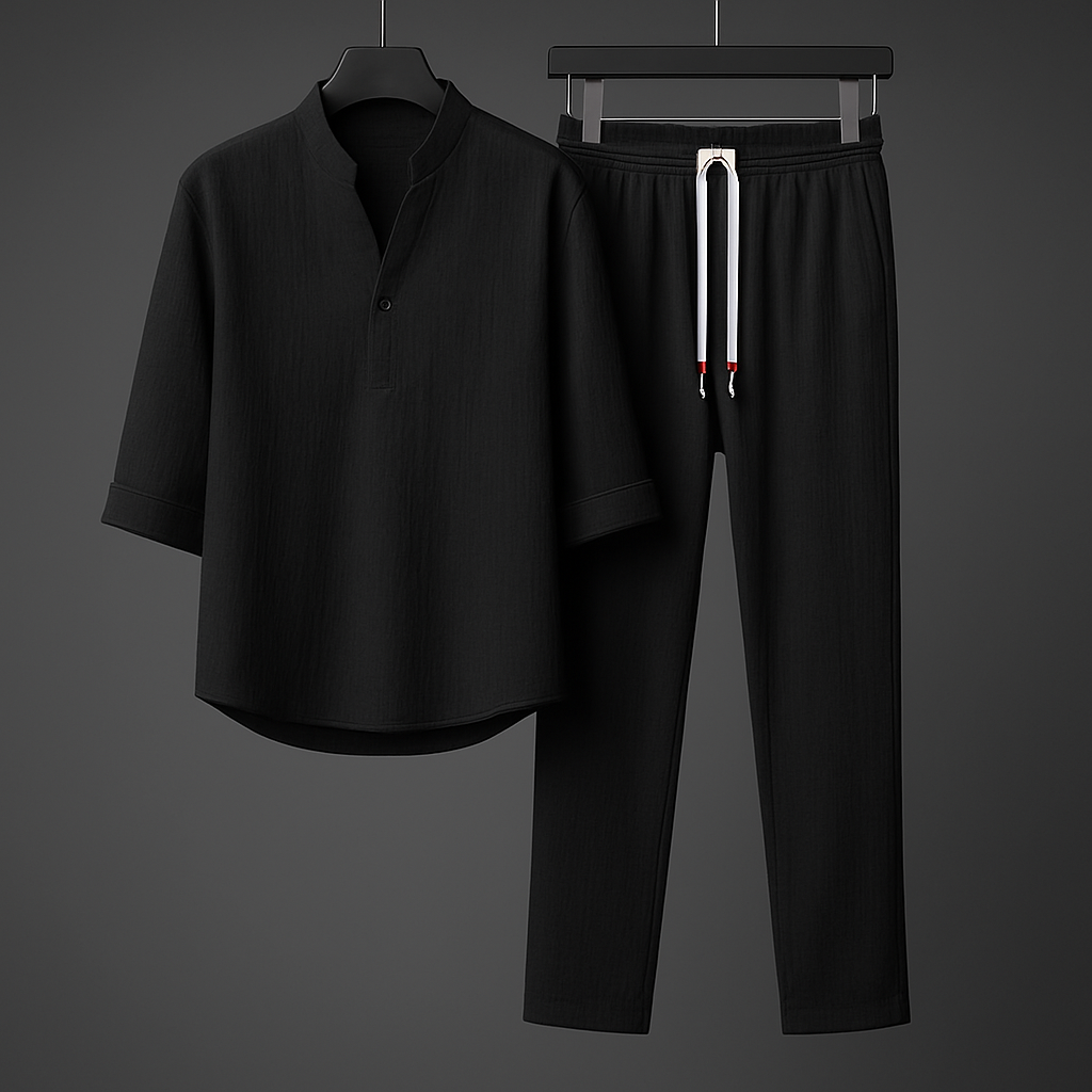 Crafted from crinkle-textured cotton, this set feels breezy against the skin with a soft, broken-in touch from day one. The band collar pullover and tapered drawstring pants blend relaxed tailoring with low-key structure for all-day wear that's anything but basic.