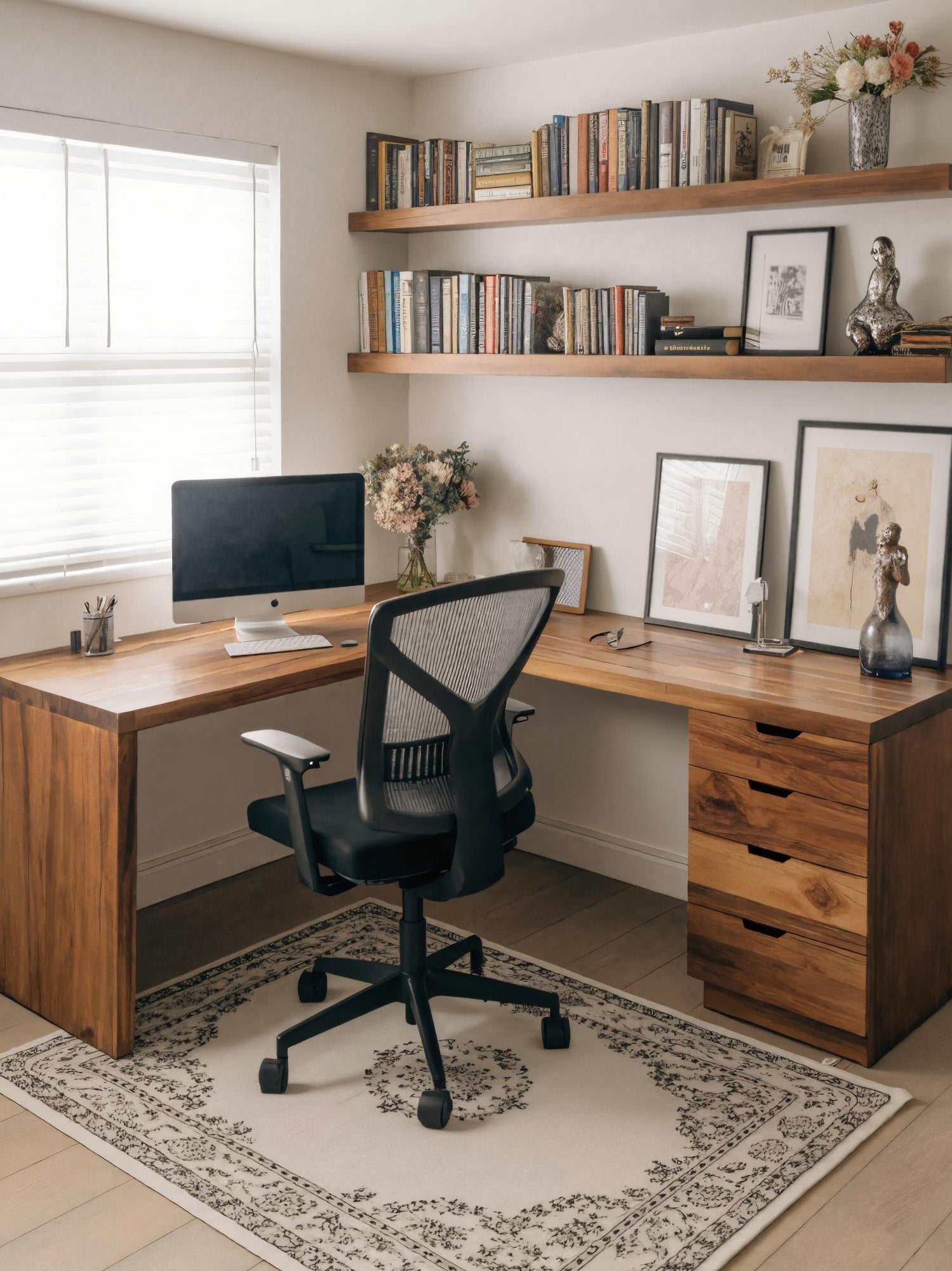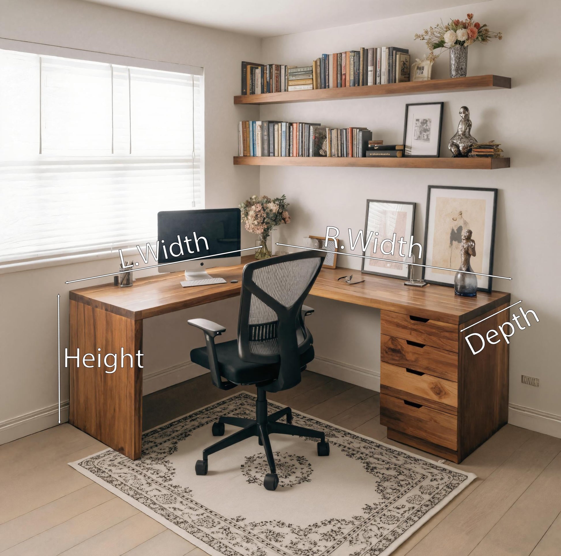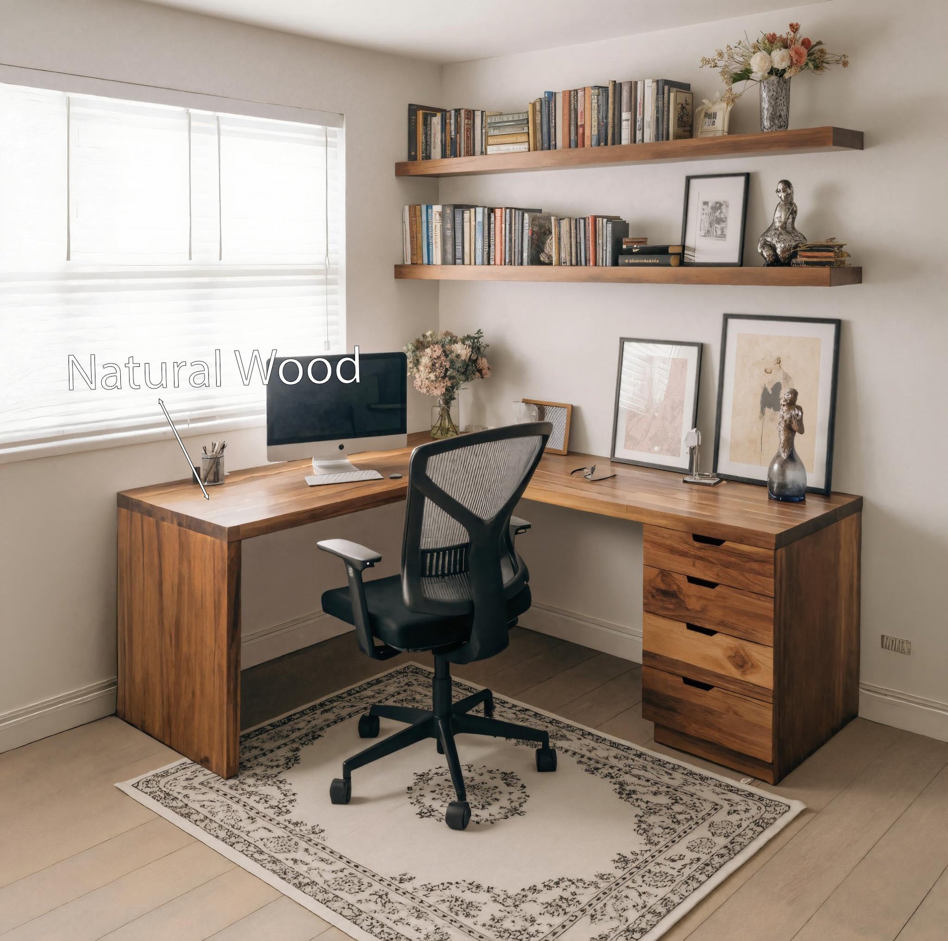 This L-shaped desk showcases a clean silhouette with a wide desktop surface, integrated drawers for storage, and an optimized corner layout. Its thoughtful design provides ample room for both computing and writing, making it highly versatile for different work styles.