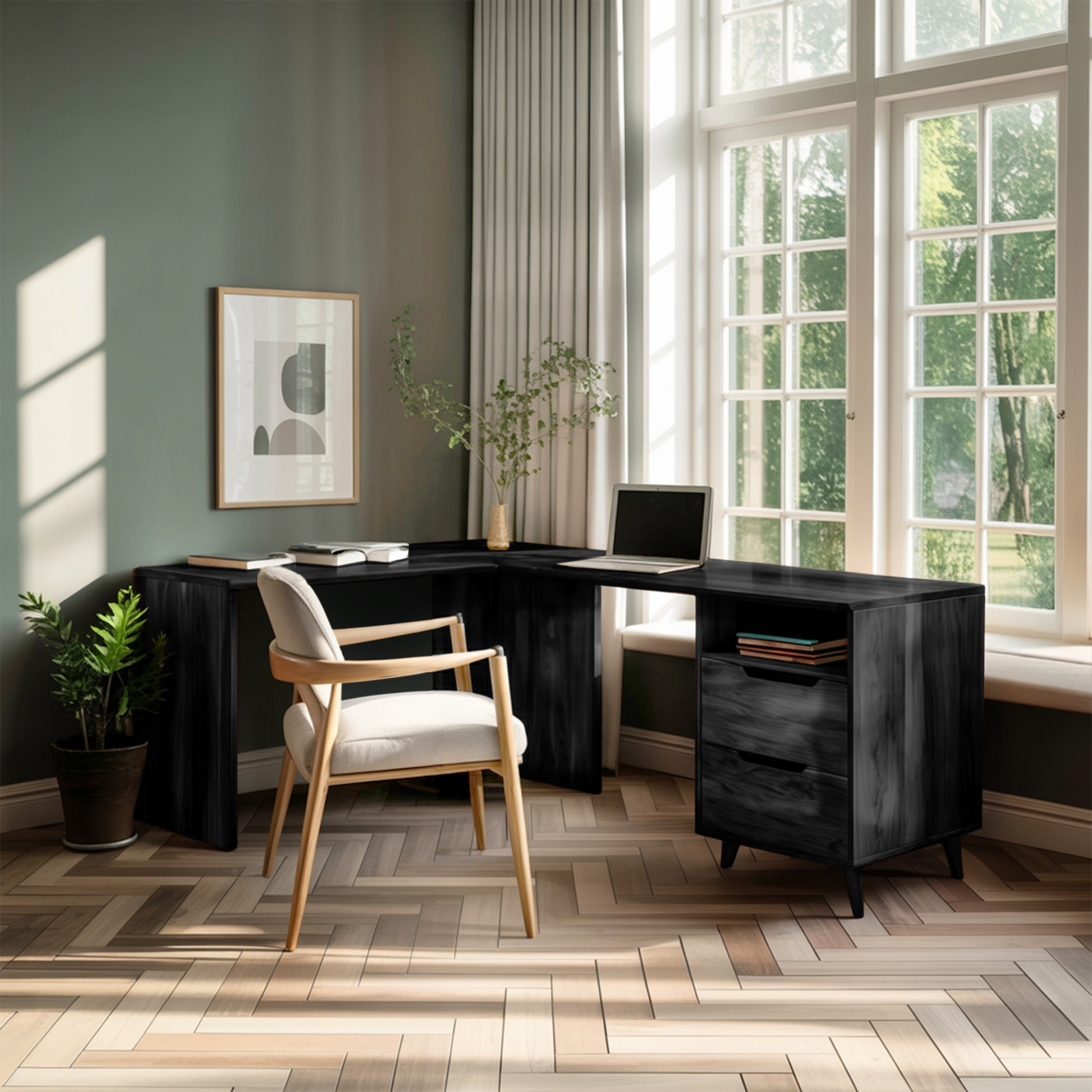 This L-shaped desk features a clean, graceful form with a long, extended work surface that provides flexibility for multitasking. The corner layout helps maximize room flow, while the integrated drawers and open cubbies offer convenient storage for books, documents, and office accessories. Its balanced proportions make it suitable for bright home offices, study corners, or creative workspaces.