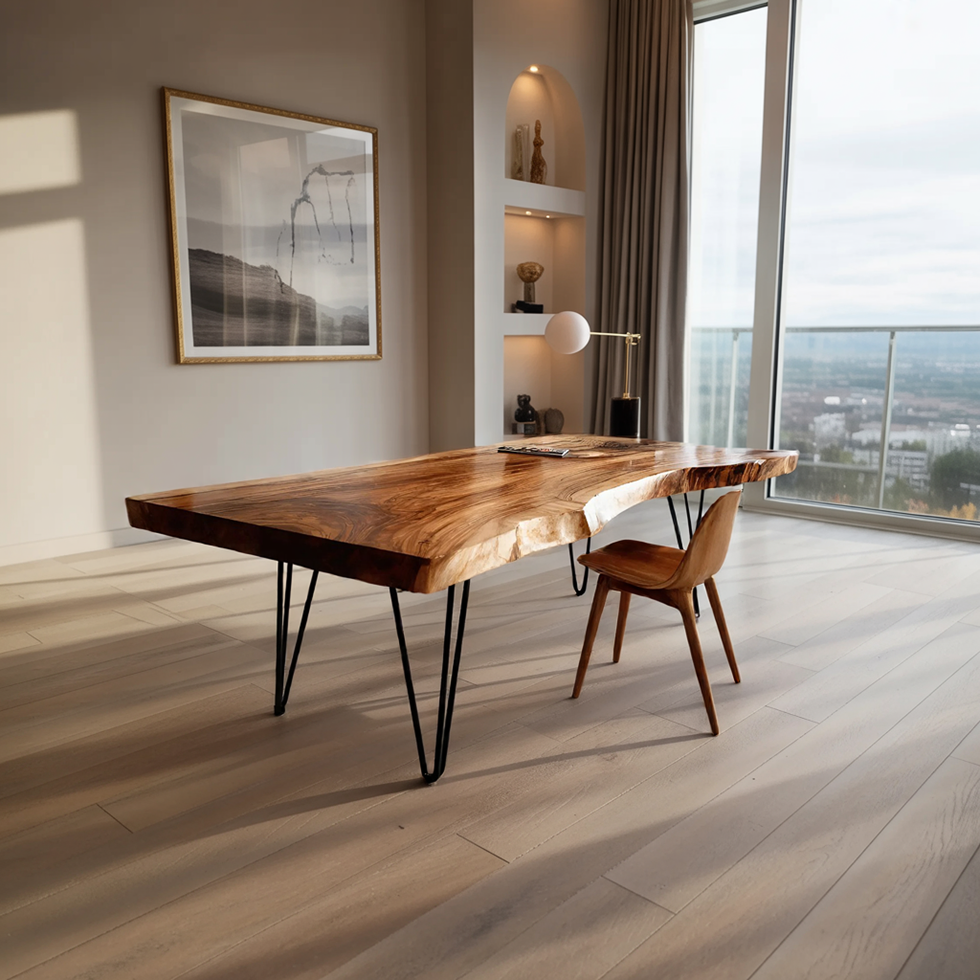This desk is meticulously handcrafted from carefully selected solid monkey pod wood, showcasing flowing live edges, rich grain movement, and natural variations that make each piece one-of-a-kind. Designed with a timeless silhouette, it blends artisanal craftsmanship with enduring functionality, suitable for both contemporary and rustic-inspired spaces.